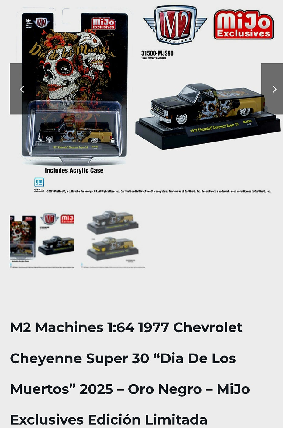 Get ready to celebrate the Day of the Dead with the M2 Chevy Cheyenne Super 30 Día de los Muertos. This 1:64 scale model features a 1977 Chevy Cheyenne Super 30 with vibrant and intricate designs inspired by the traditional holiday. Perfect for collectors and fans of unique automotive designs.